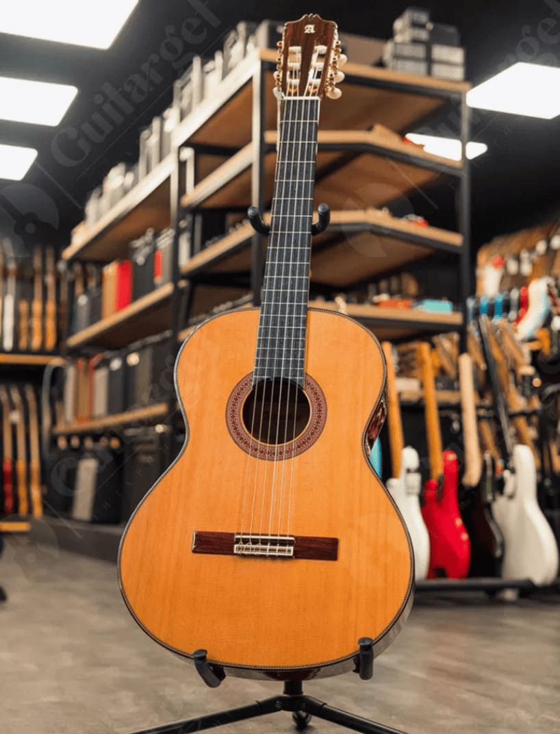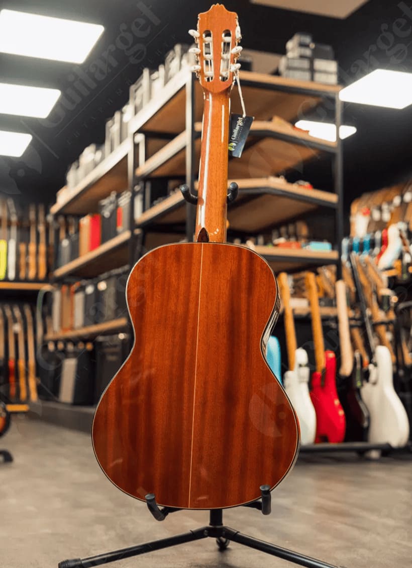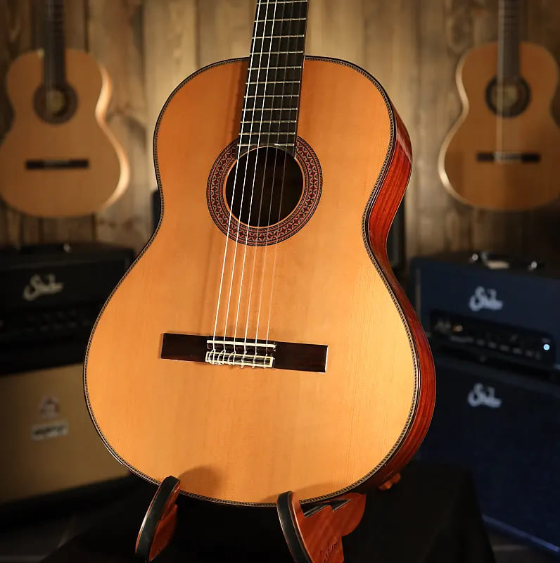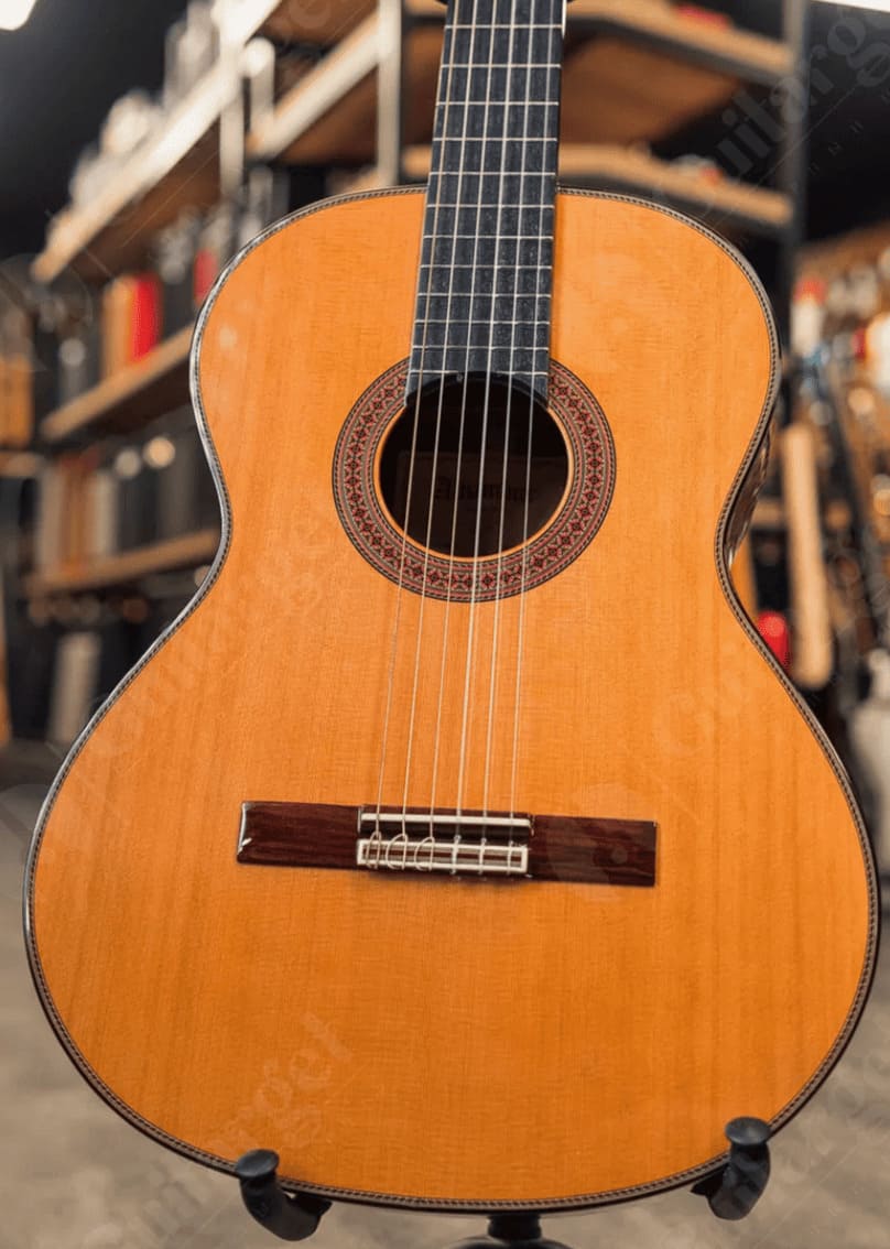 Модель 7C полностью изготовлена вручную из массива кедра и красного дерева. Накладка грифа из красивого черного дерева высочайшего качества. Как и у концертных гитар, гриф усилен полосой черного дерева вместо анкерного стержня. Компактный и легкий он позволяет вибрировать всему инструменту от головки грифа до нижней части корпуса. Звучание гитары чистое, насыщенное и чрезвычайно универсальное.